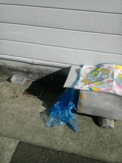 ダンボールハウスにお水とご飯用タッパ